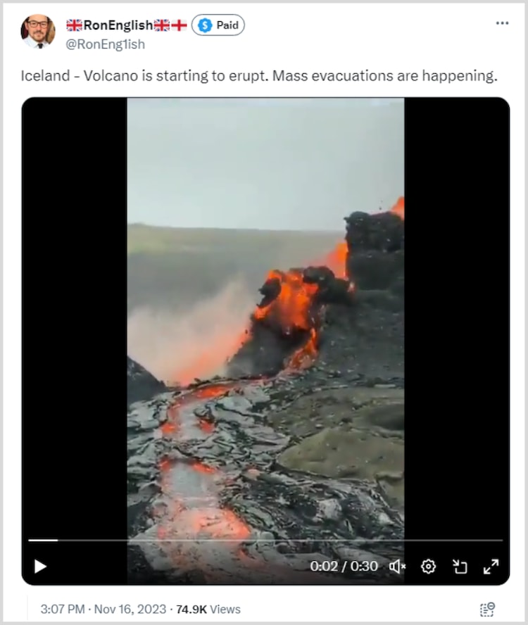 इस बीच, इलाके से लोगों के भागने के दौरान ज्वालामुखी से लावा निकलने का एक वीडियो सोशल मीडिया पर व्यापक रूप से साझा किया गया। क्लिप शेयर करने वालों ने दावा किया कि आइसलैंड में ज्वालामुखी विस्फोट शुरू हो गया है। एक व्यक्ति ने फेसबुक पर क्लिप साझा करते हुए लिखा, “यहां हम जाते हैं, अगर ब्रिटेन पहले से ही धूसर नहीं होता तो संभवतः यह राख के बादल में ढका होता। आइसलैंड - ज्वालामुखी फूटना शुरू हो गया है। बड़े पैमाने पर निकासी हो रही है।” ऐसी ही पोस्ट का आर्काइव्ड वर्जन यहां देखा जा सकता है।